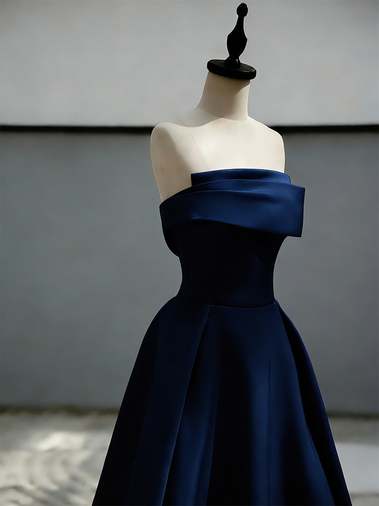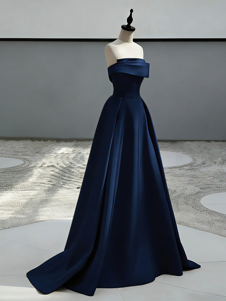 A-Line Sweep Train Satin Dark Blue Long Prom Dress