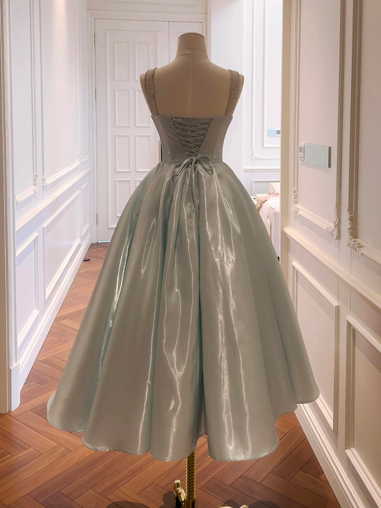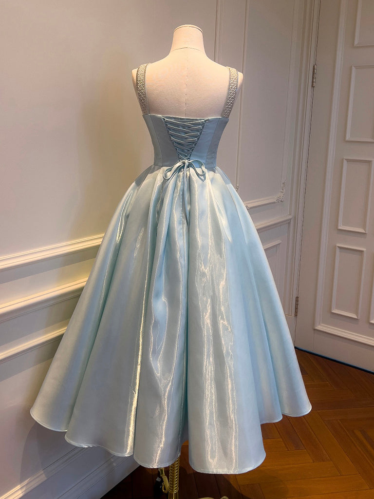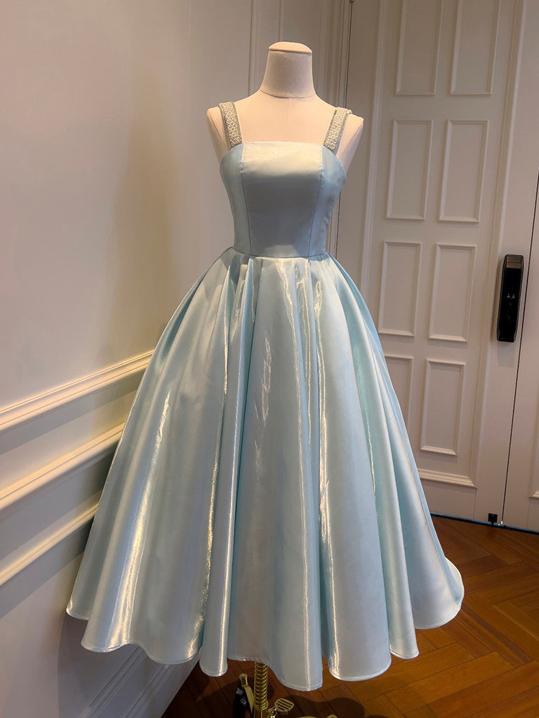 A-Line Tea Length Satin Blue Prom Dress With Beaded Shoulder Straps