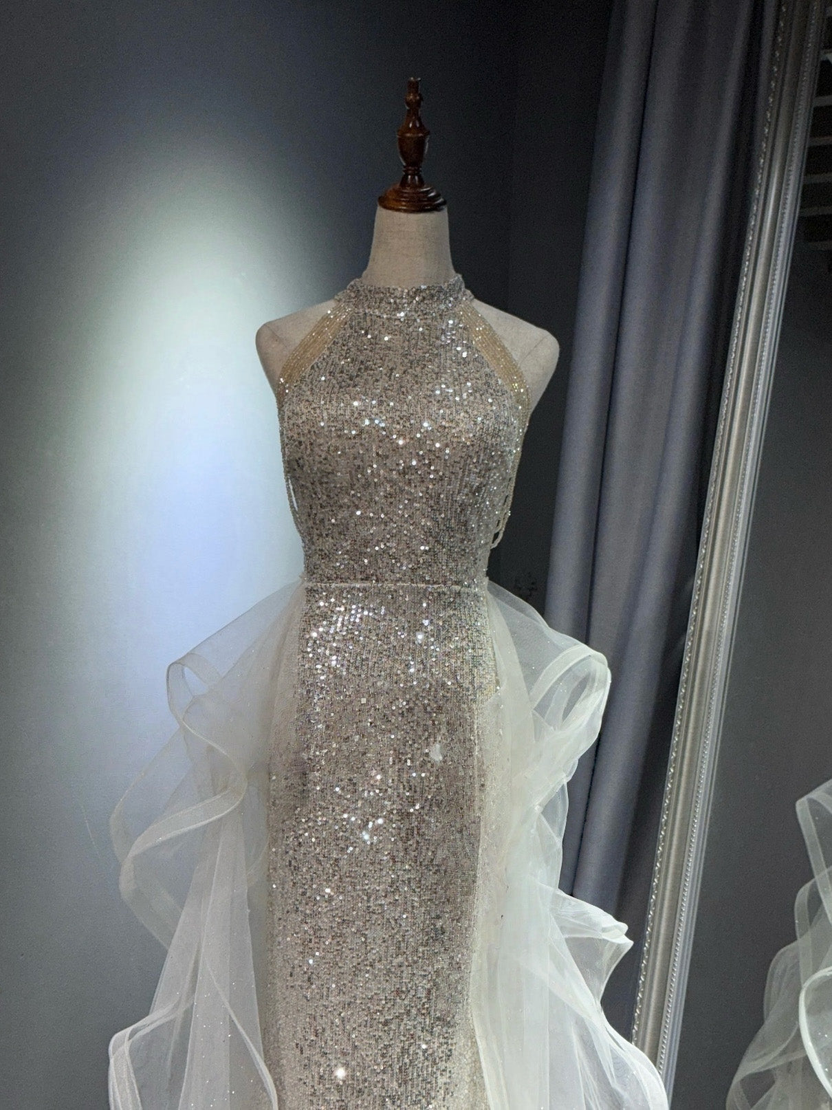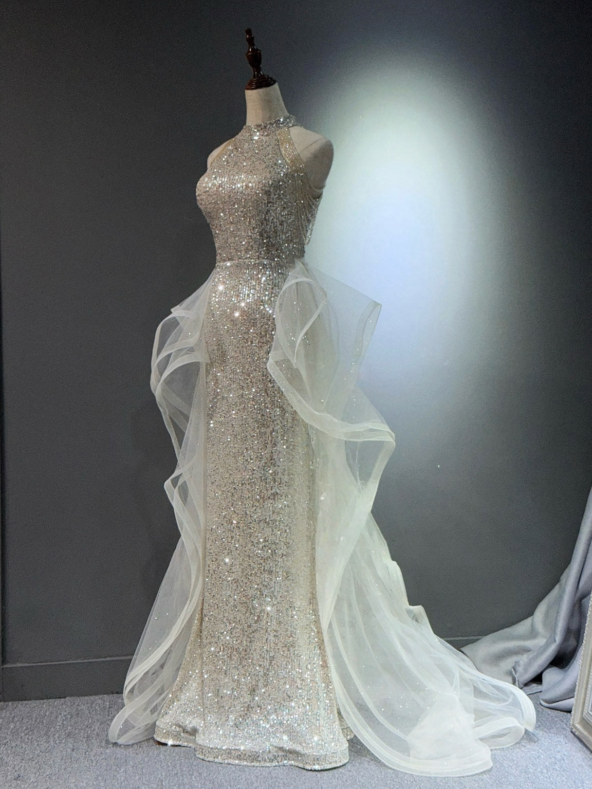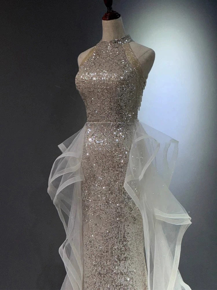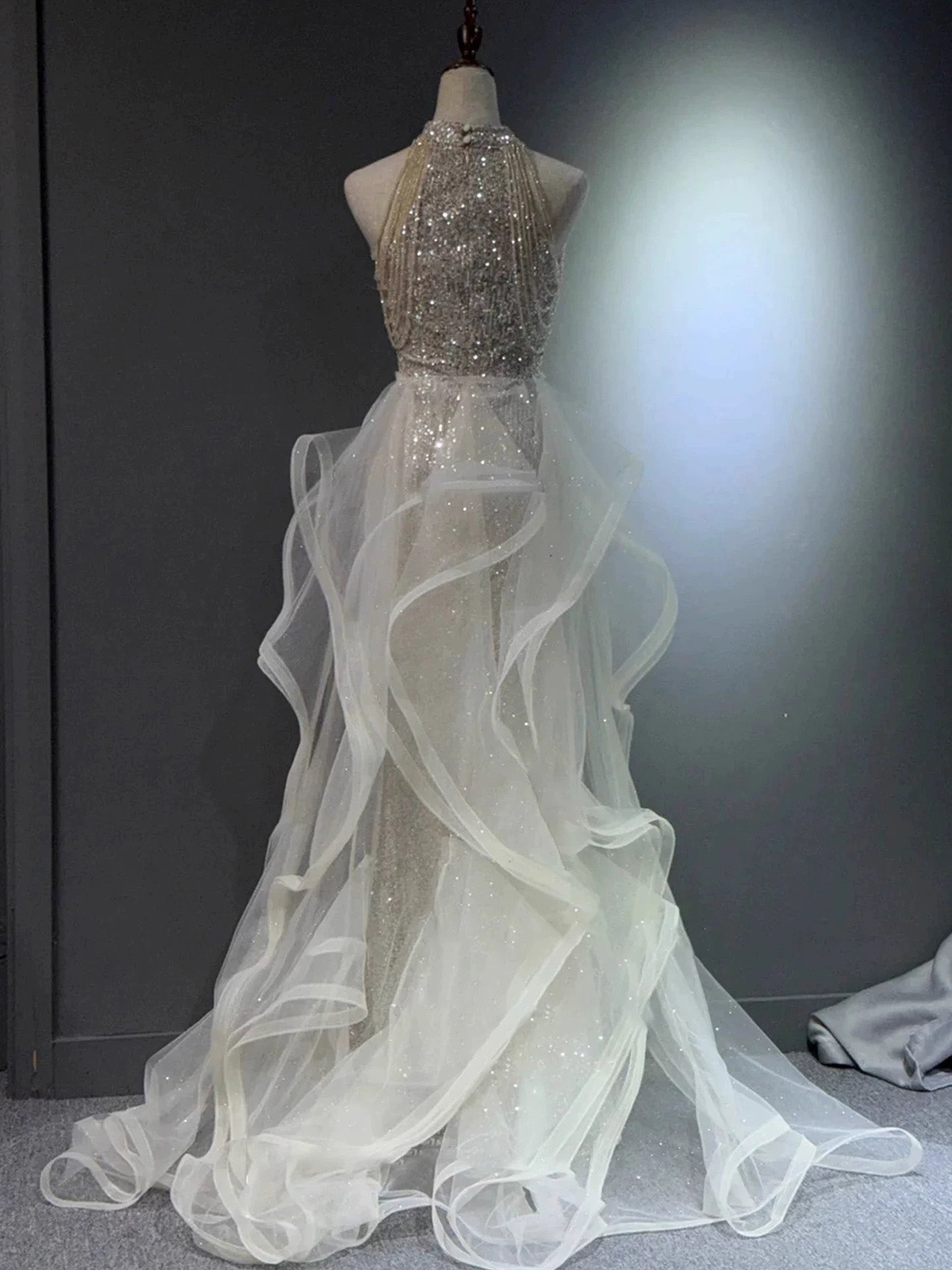 A-Line Tulle Sequin Sweep Train Light Champagne Long Prom Dress with Beads