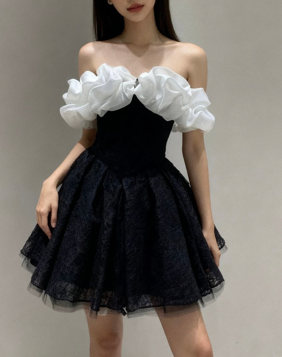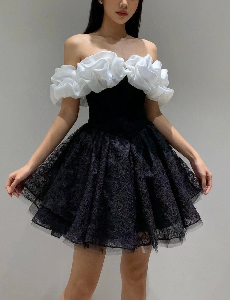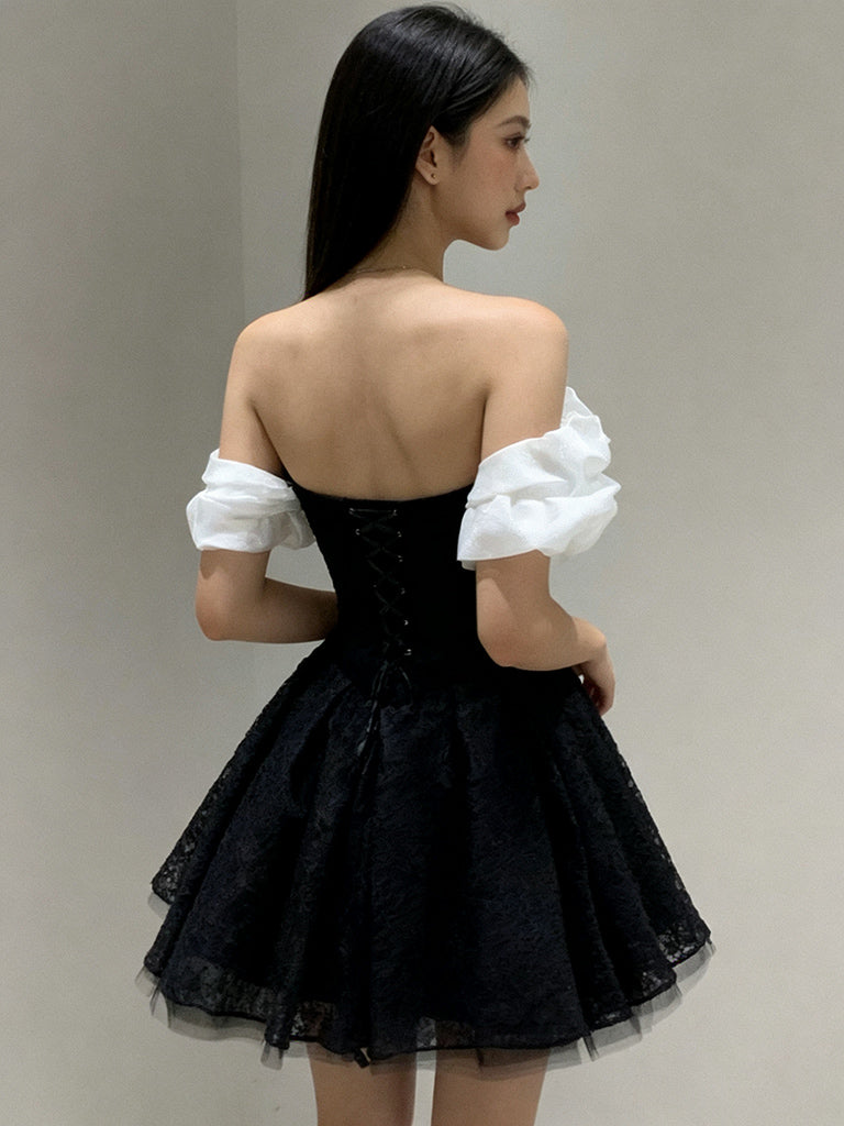 A-Line Off Shoulder Tulle Lace Mini Black Short Prom Dress