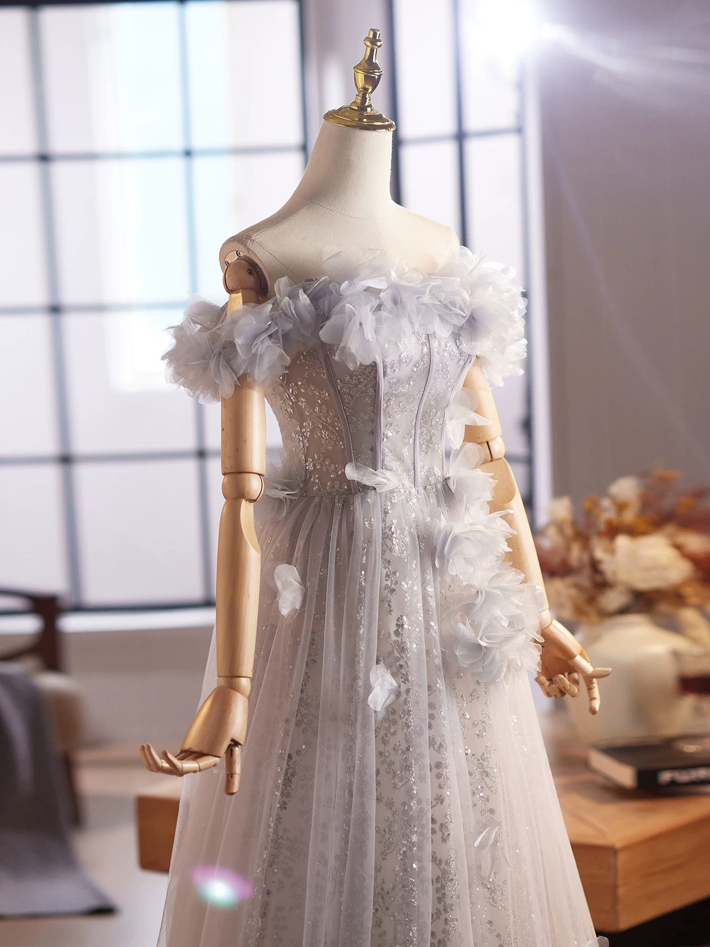 A-Line Off Shoulder Tulle Flower Applique Gray Long Prom Dress