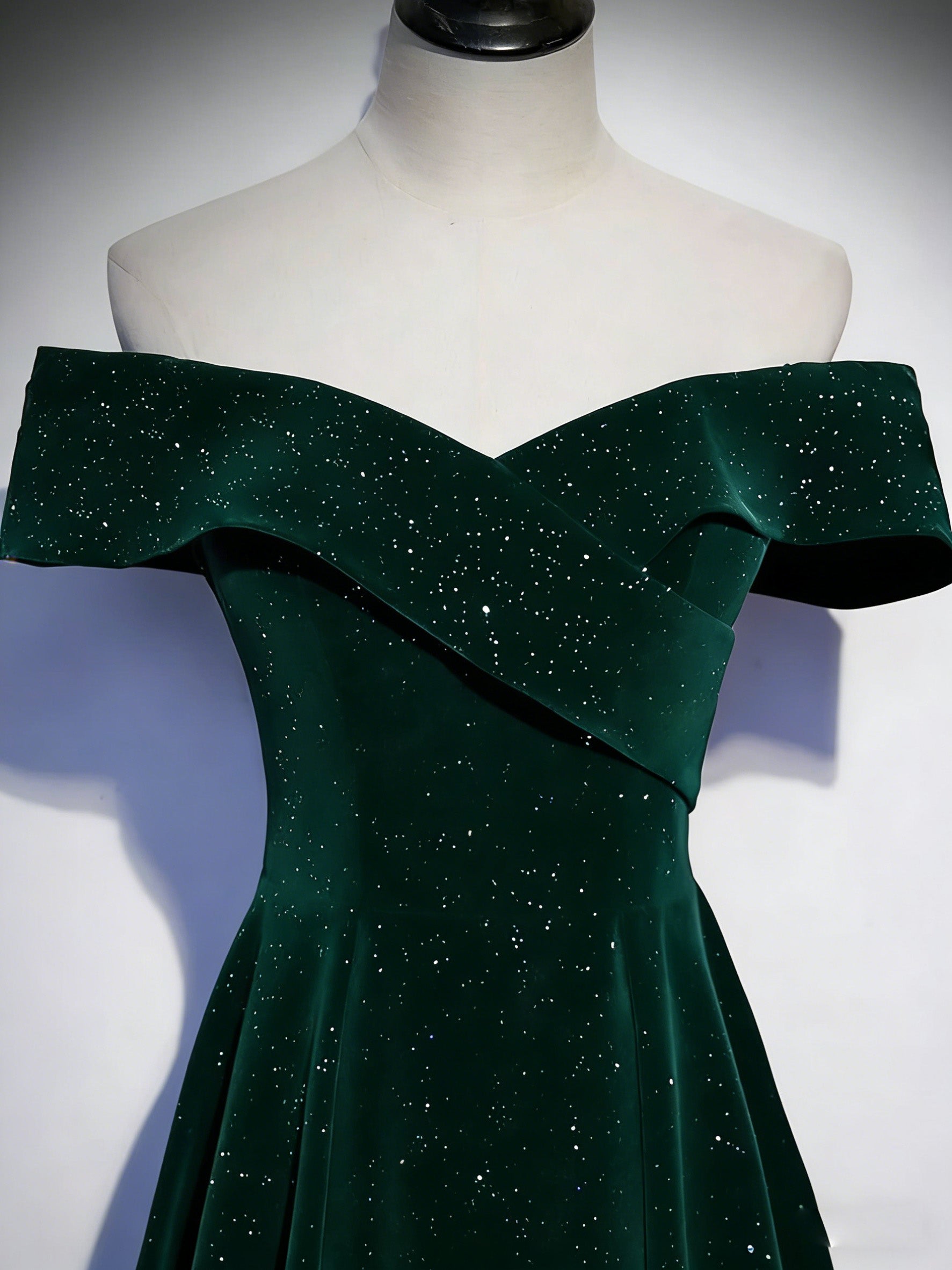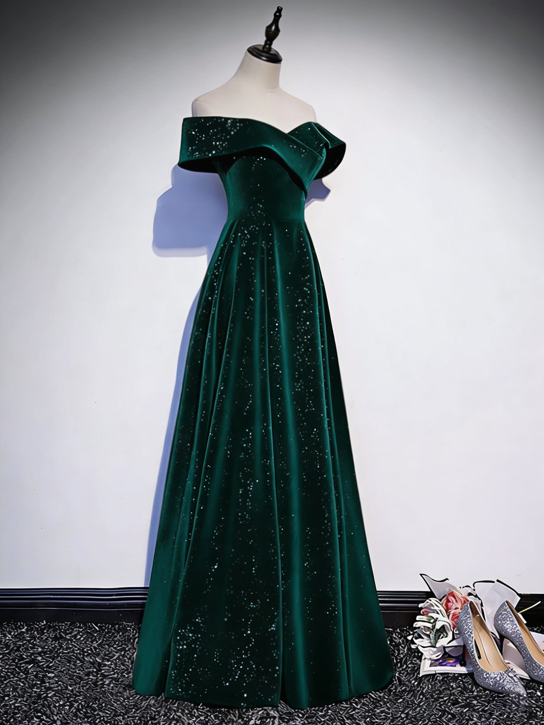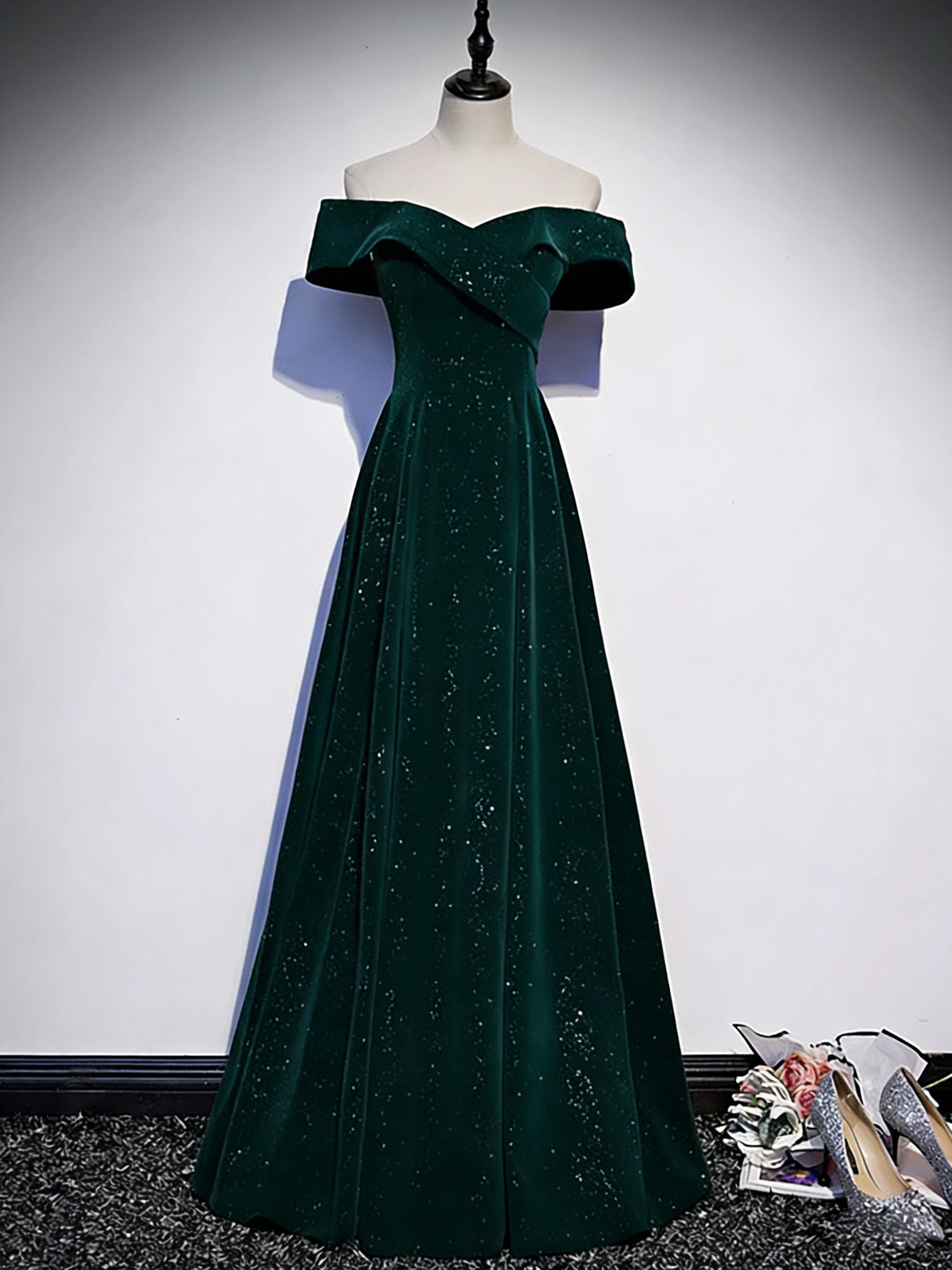 A-line Off Shoulder Velvet Floor Length Green Long Prom Dress