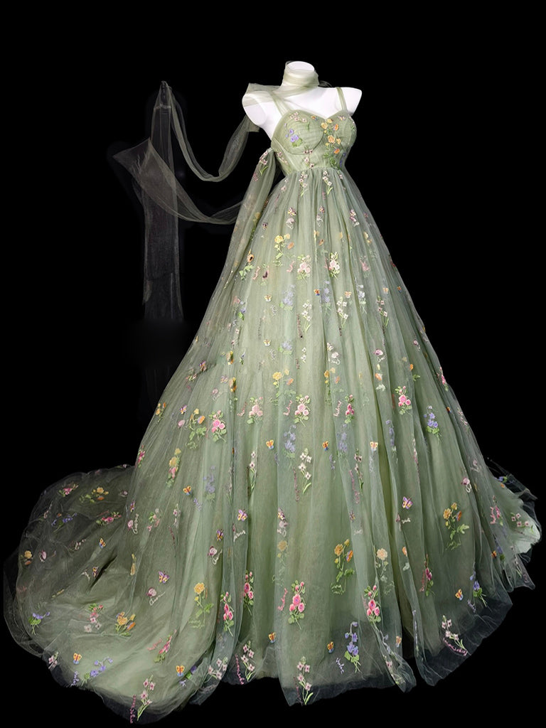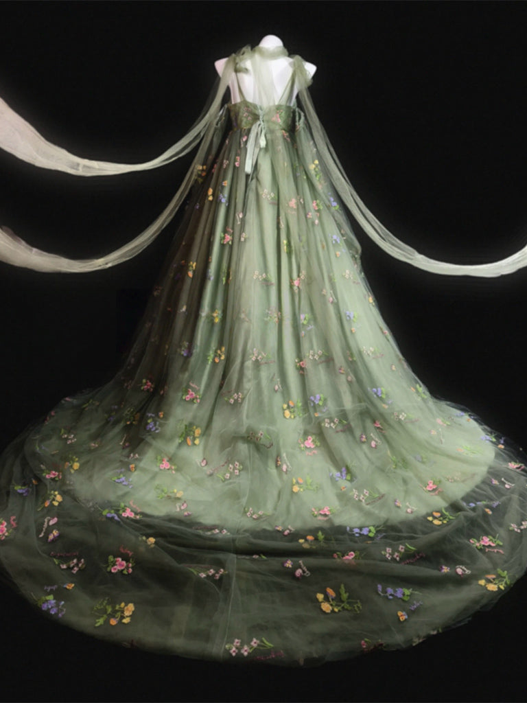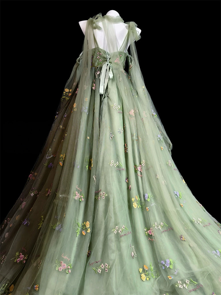 Sweetheart Tulle Lace A-line Sweep Train Green Long Prom Dress