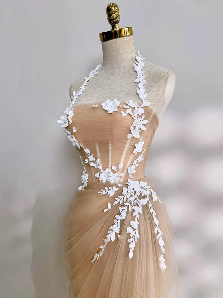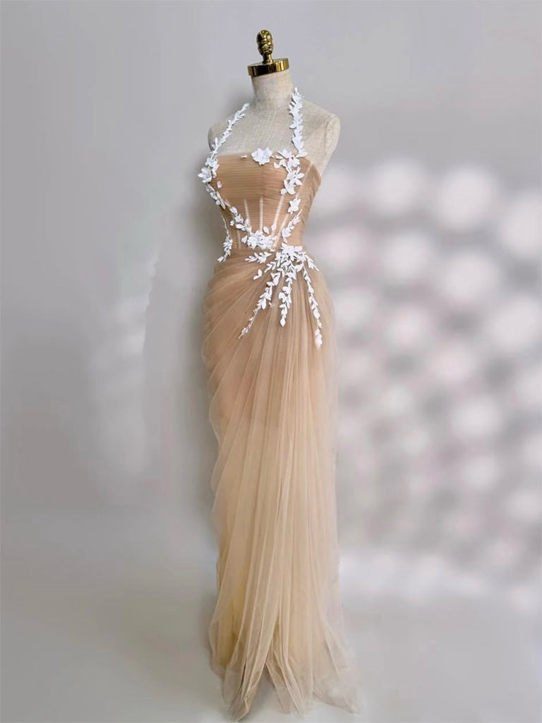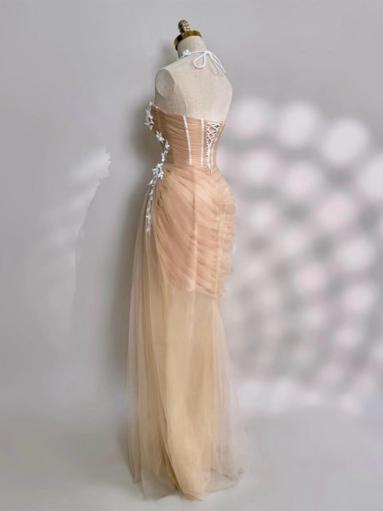 Mermaid Tulle Lace Floor Length Champagne Long Prom Dress