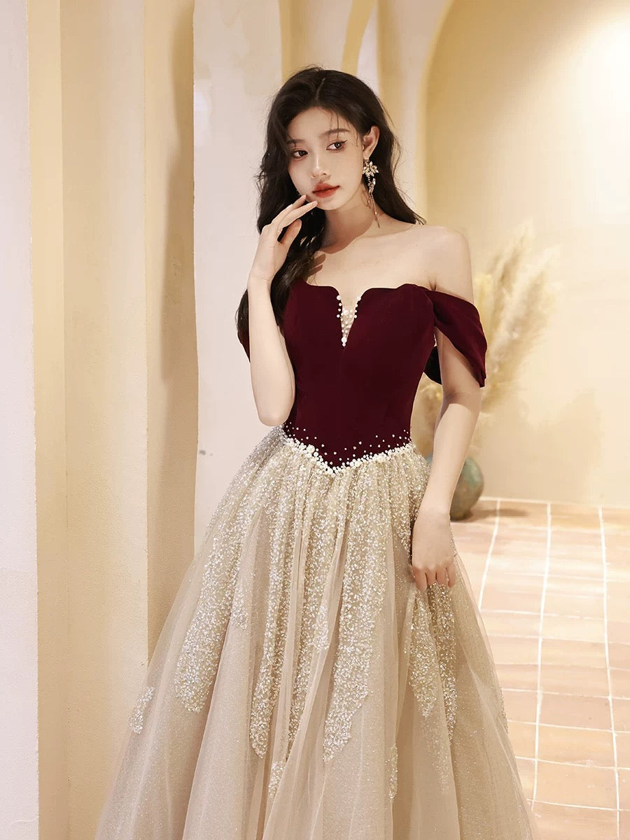 A-Line Off Shoulder Floor Length Velvet Tulle Long Prom Dress With Sequin