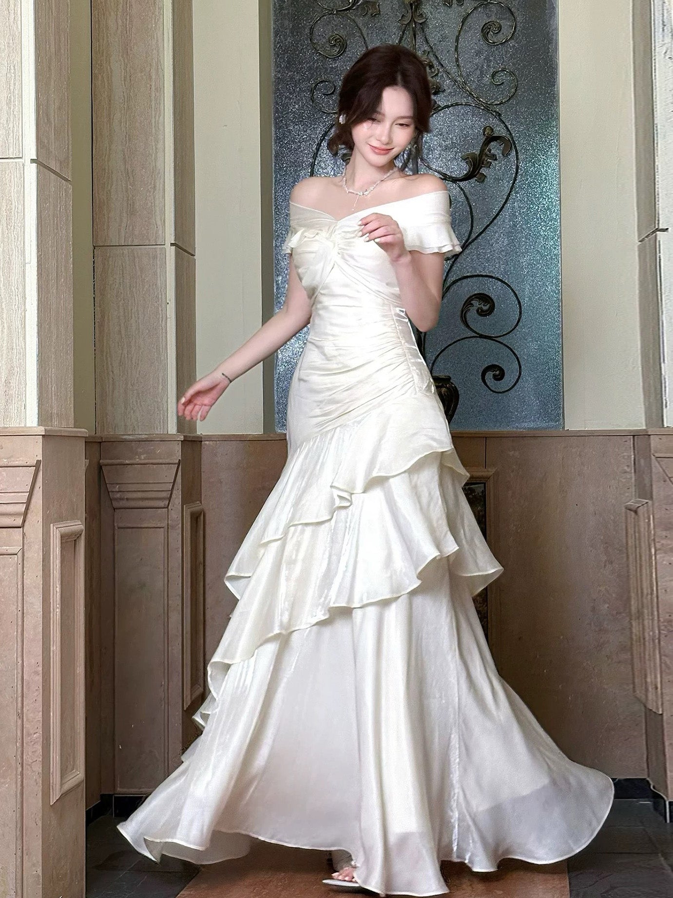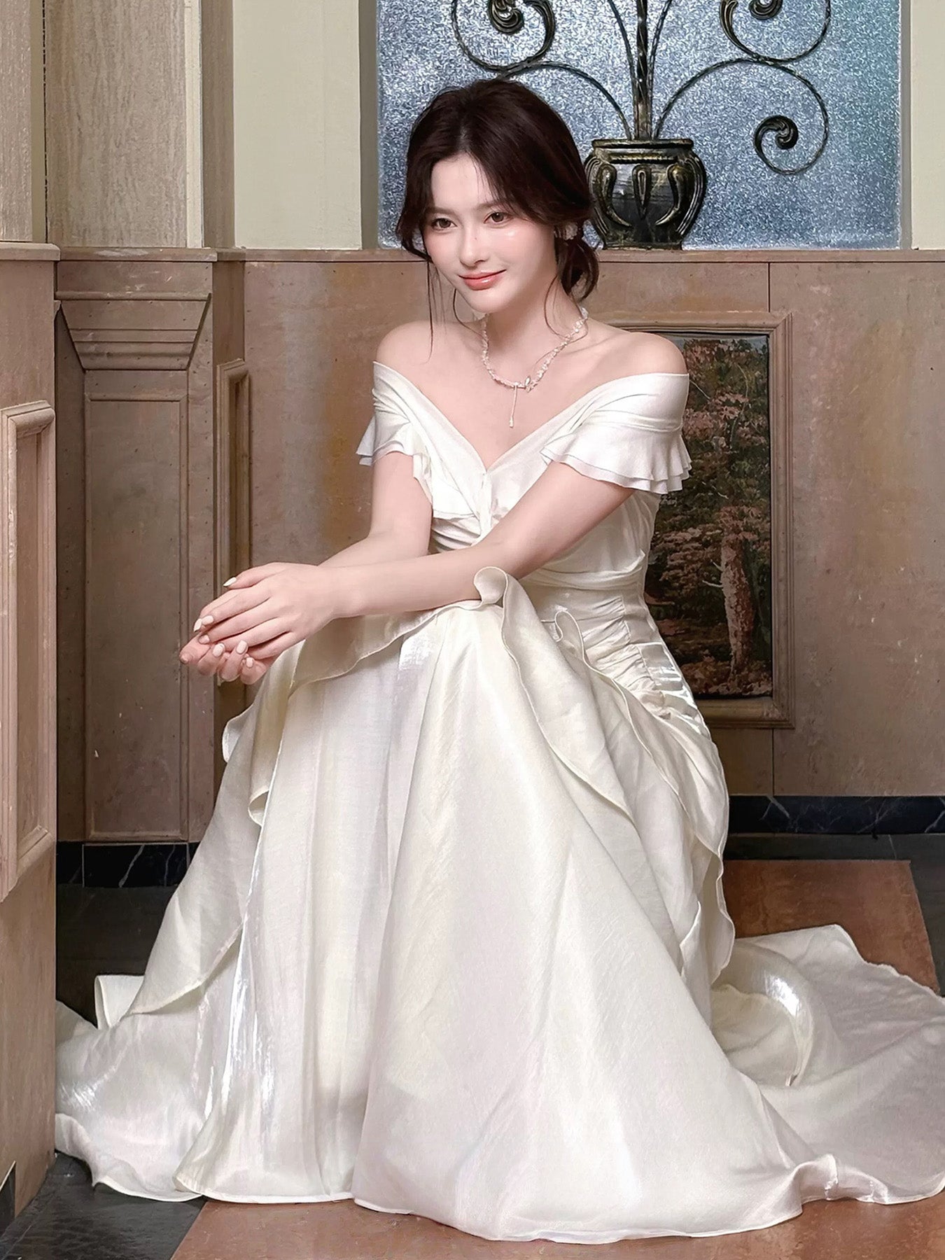 A-line Off Shoulder Off Shoulder Floor Length Light Champagne Prom Dress