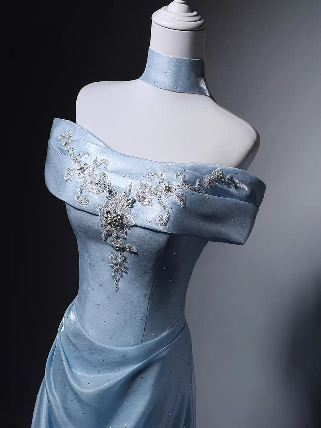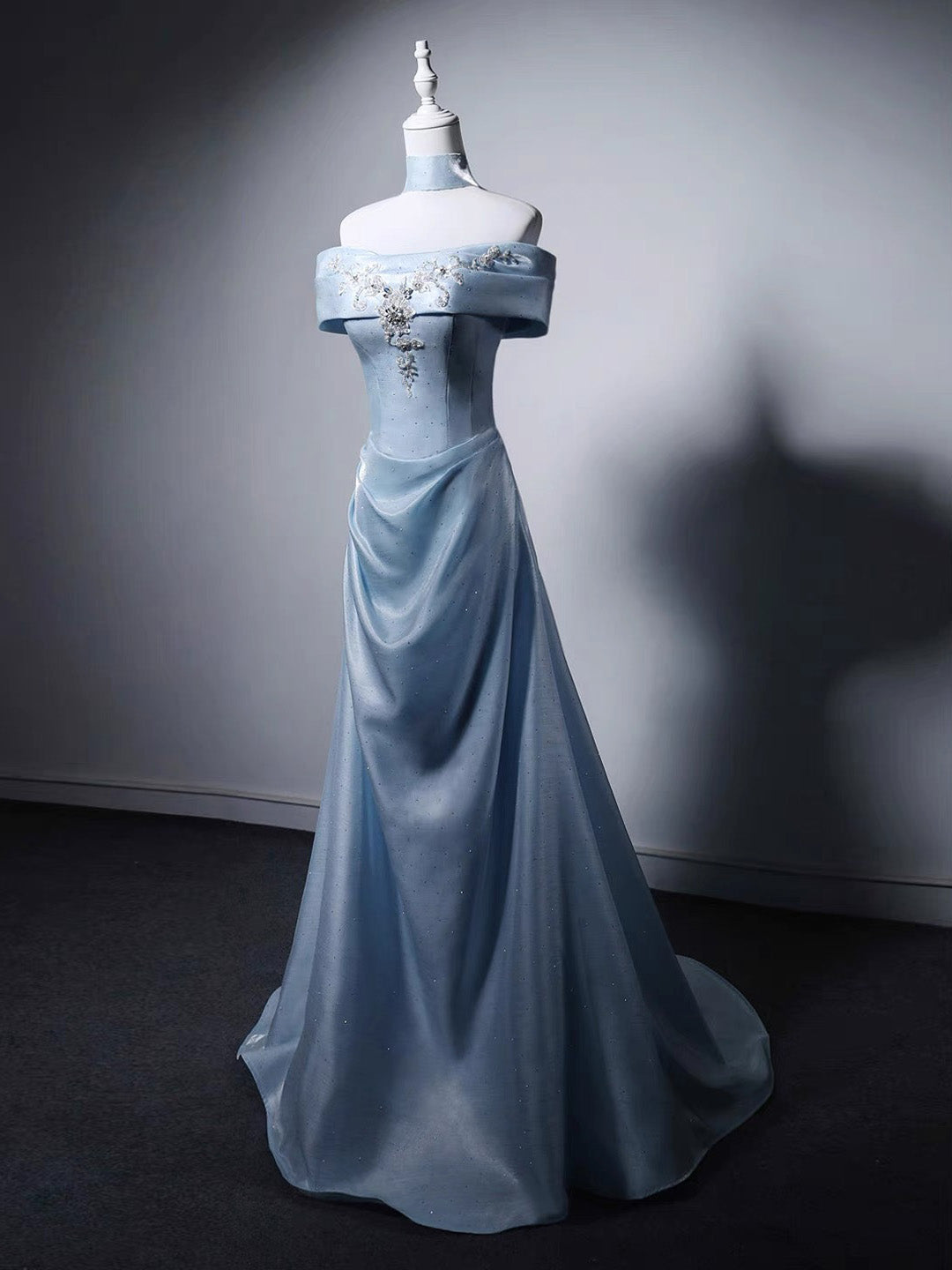 A-Line Off Shoulder Sweep Train Blue Prom Dress with Lace Applique