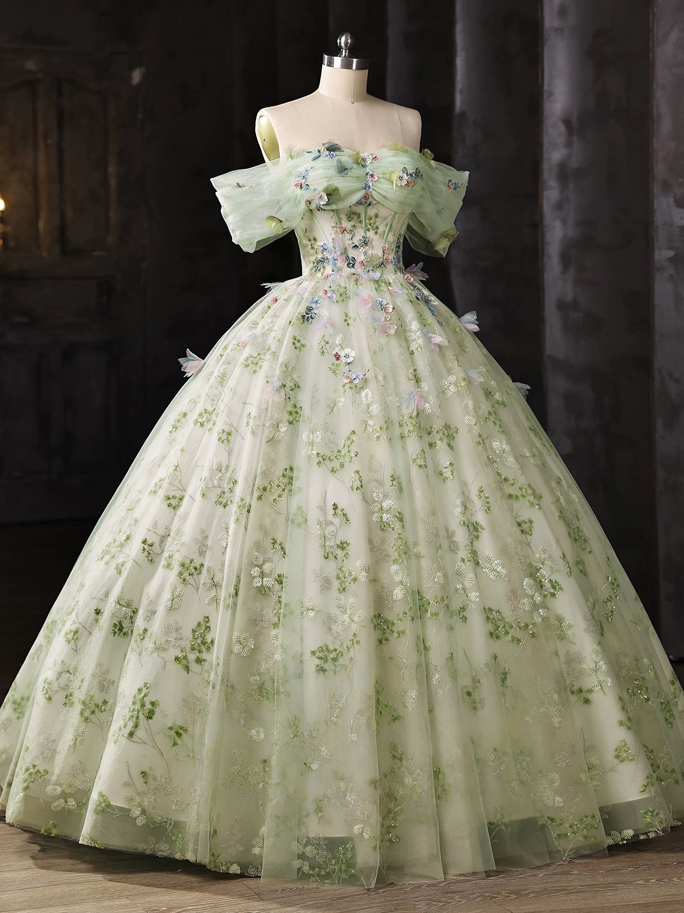 HomeProm DressesA-Line Off Shoulder Tulle Lace Green Long Prom Dress