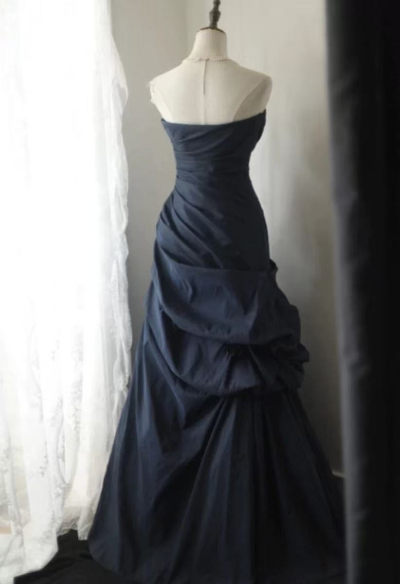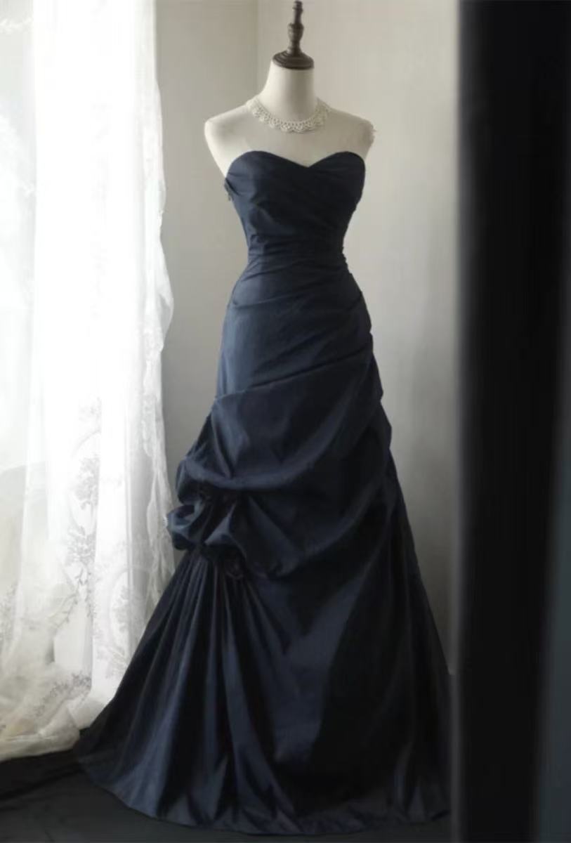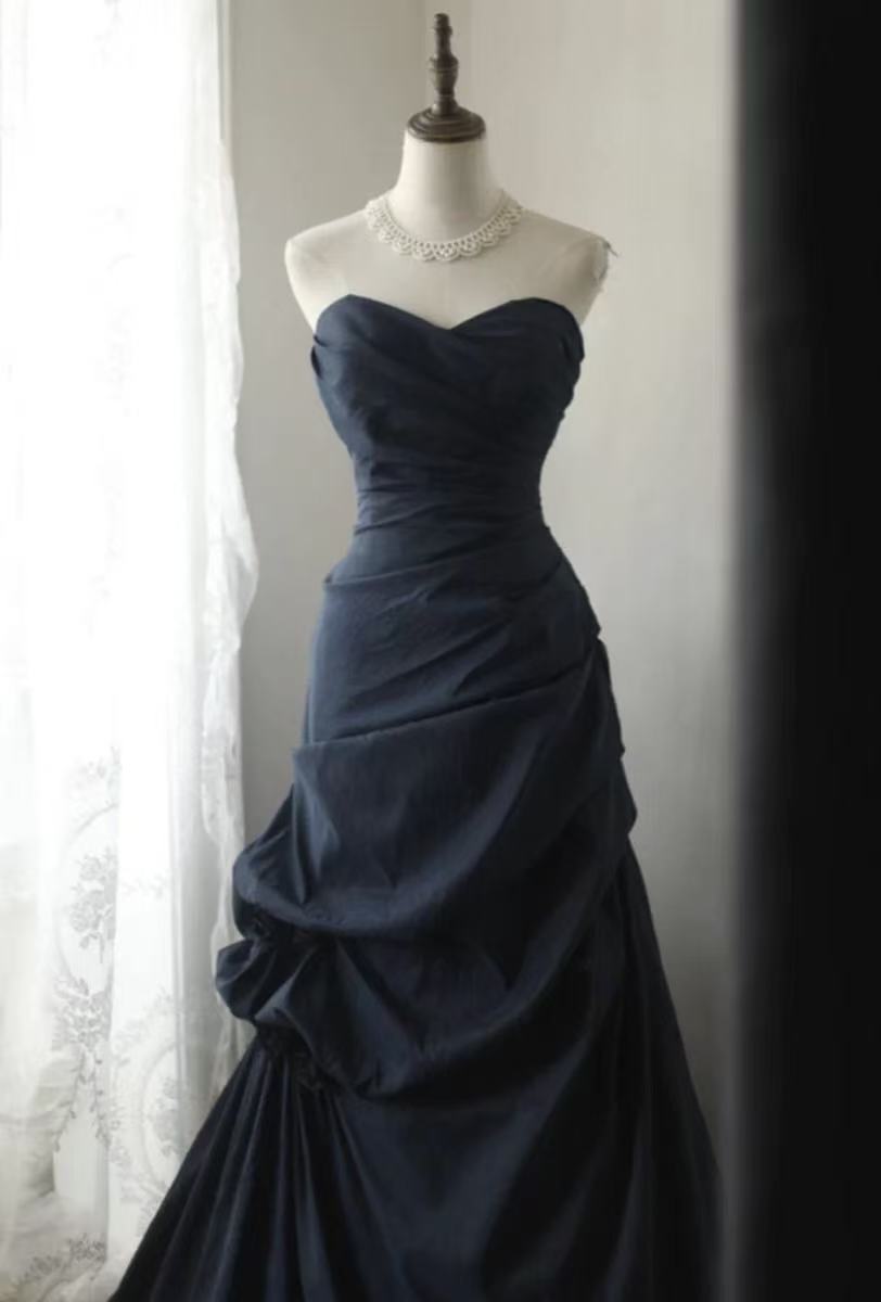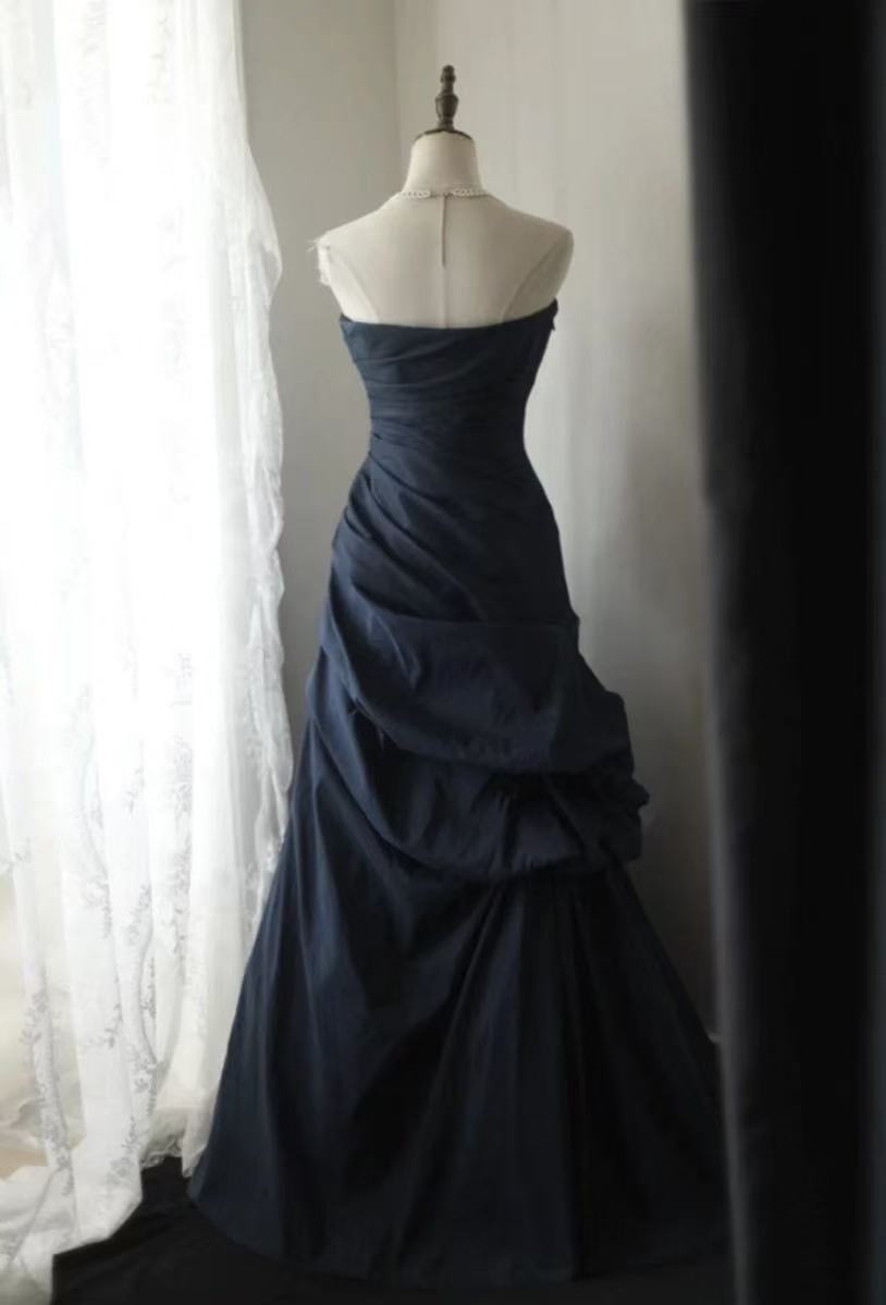 A-line Sweetheart Neck Floor Length Dark Blue Long Prom Dress