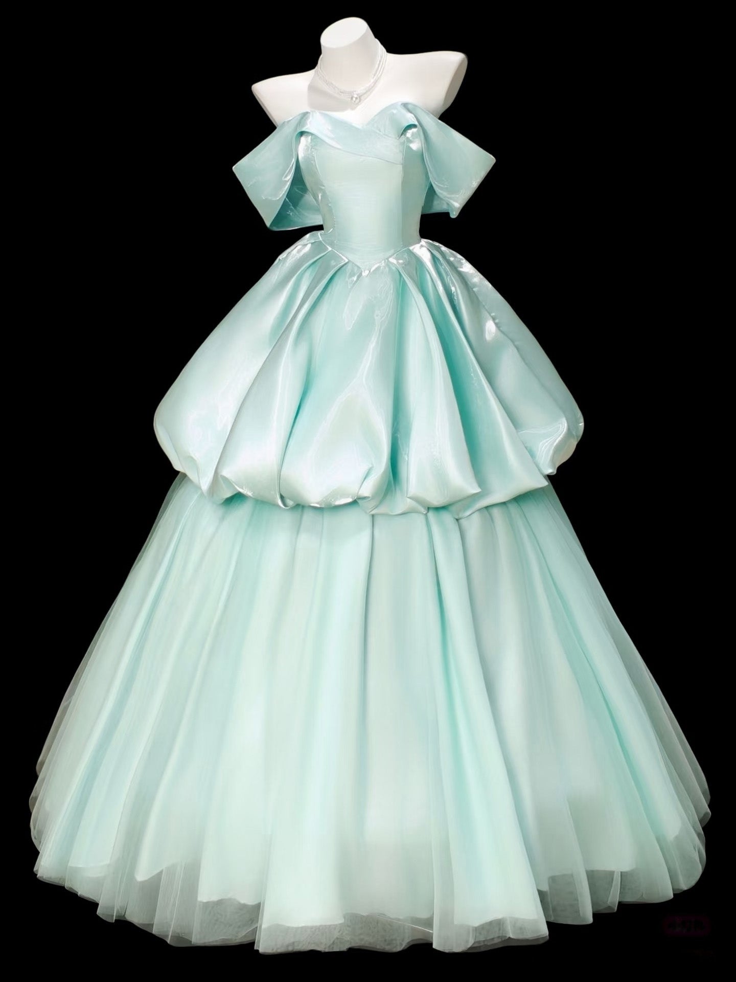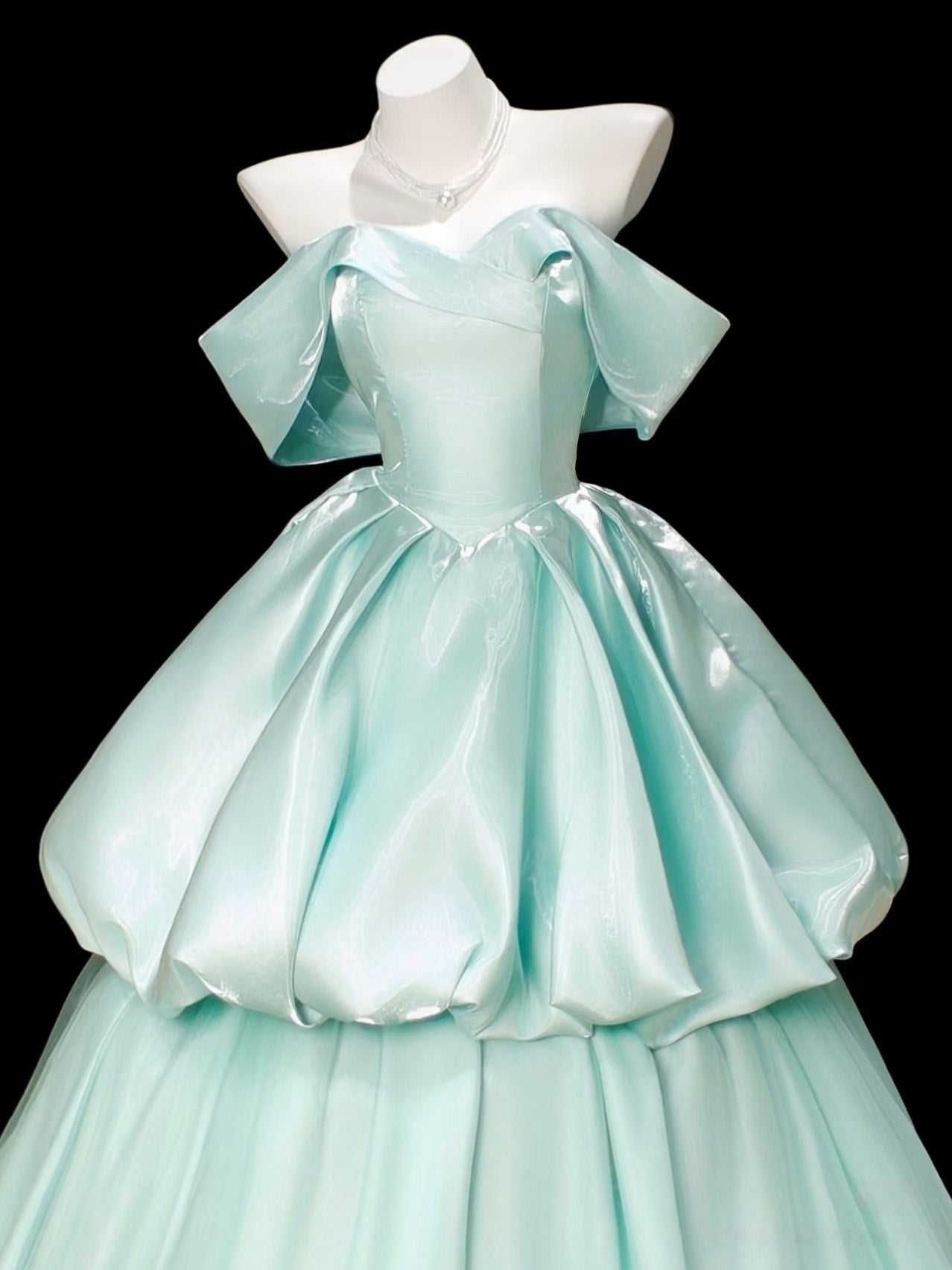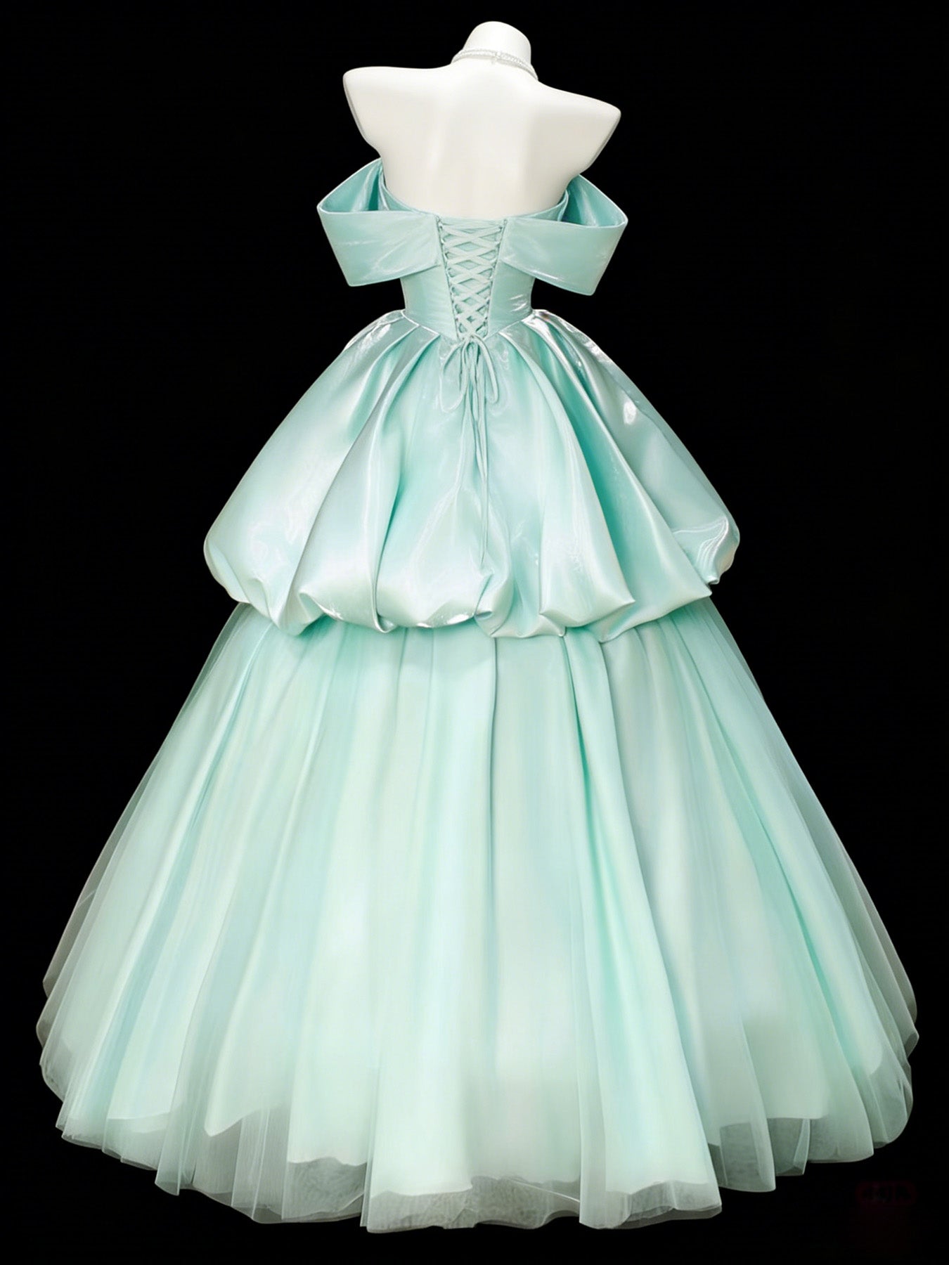 A-Line Sweetheart Neck Off Shoulder Tulle Satin Mint Green Long Prom Dress