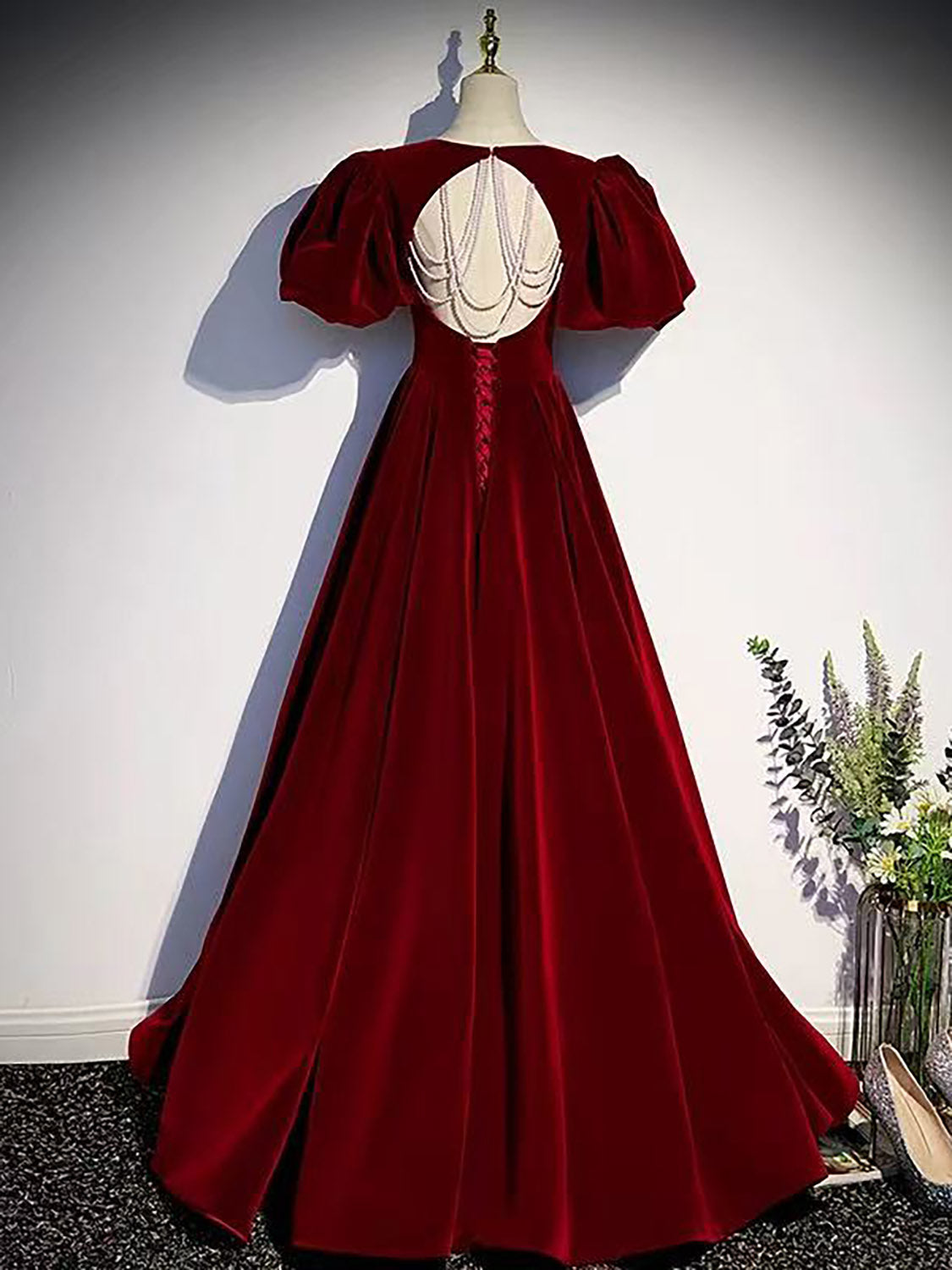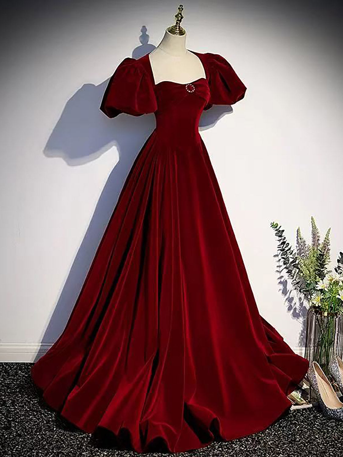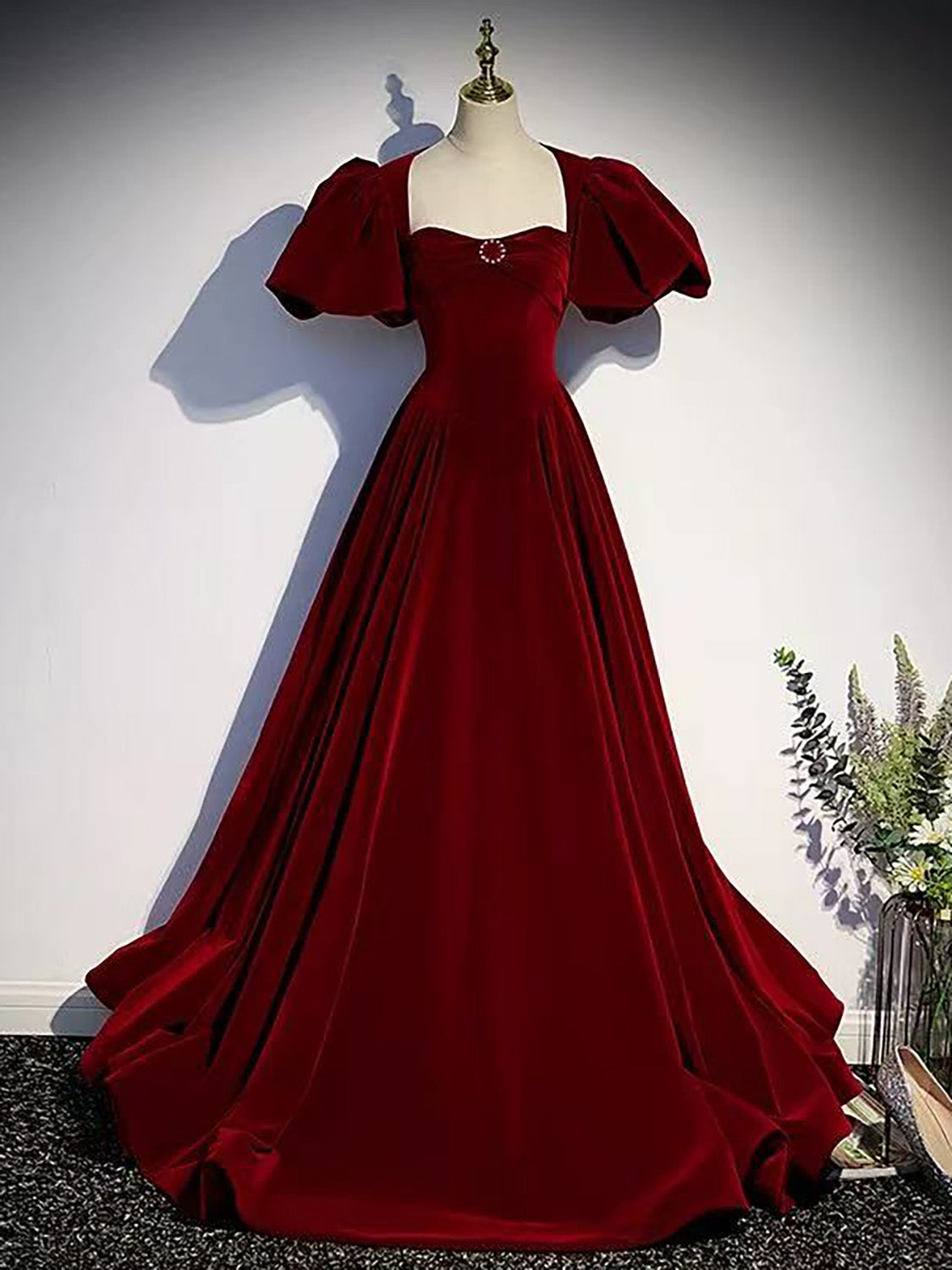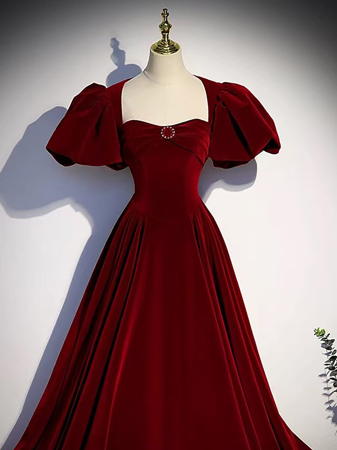 A-Line Sweetheart Neck Puff Sleeves Burgundy Long Prom Dress
