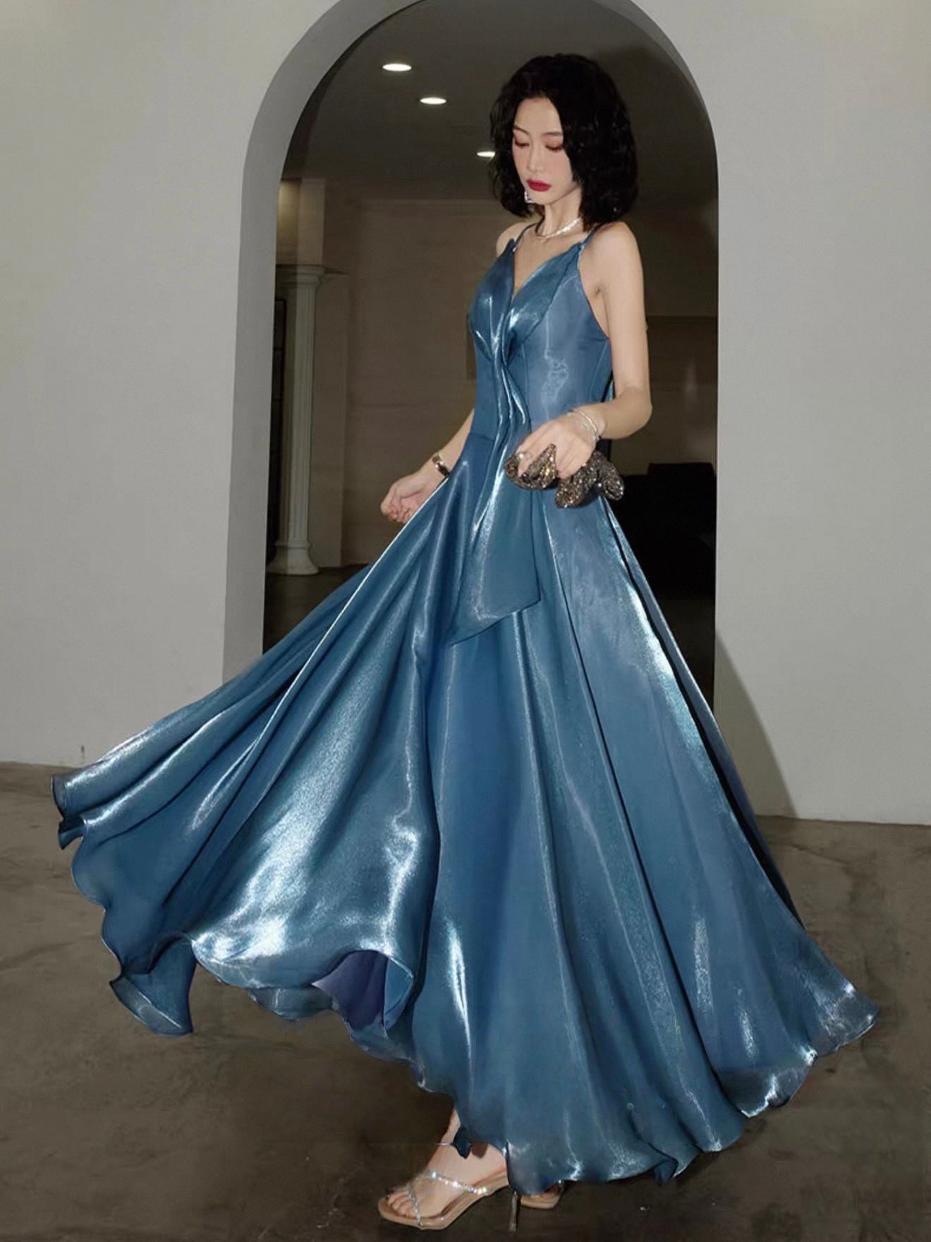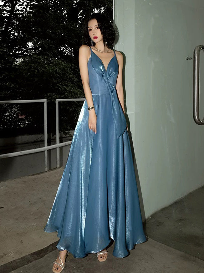 A-Line V Neck Floor Length Backless Blue Prom Dress