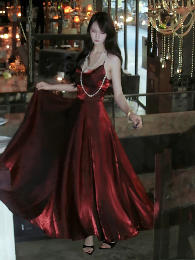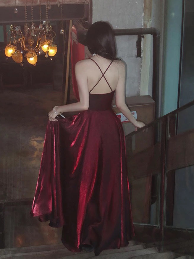 A-line V Neck Floor Length Burgundy Party Prom Dress
