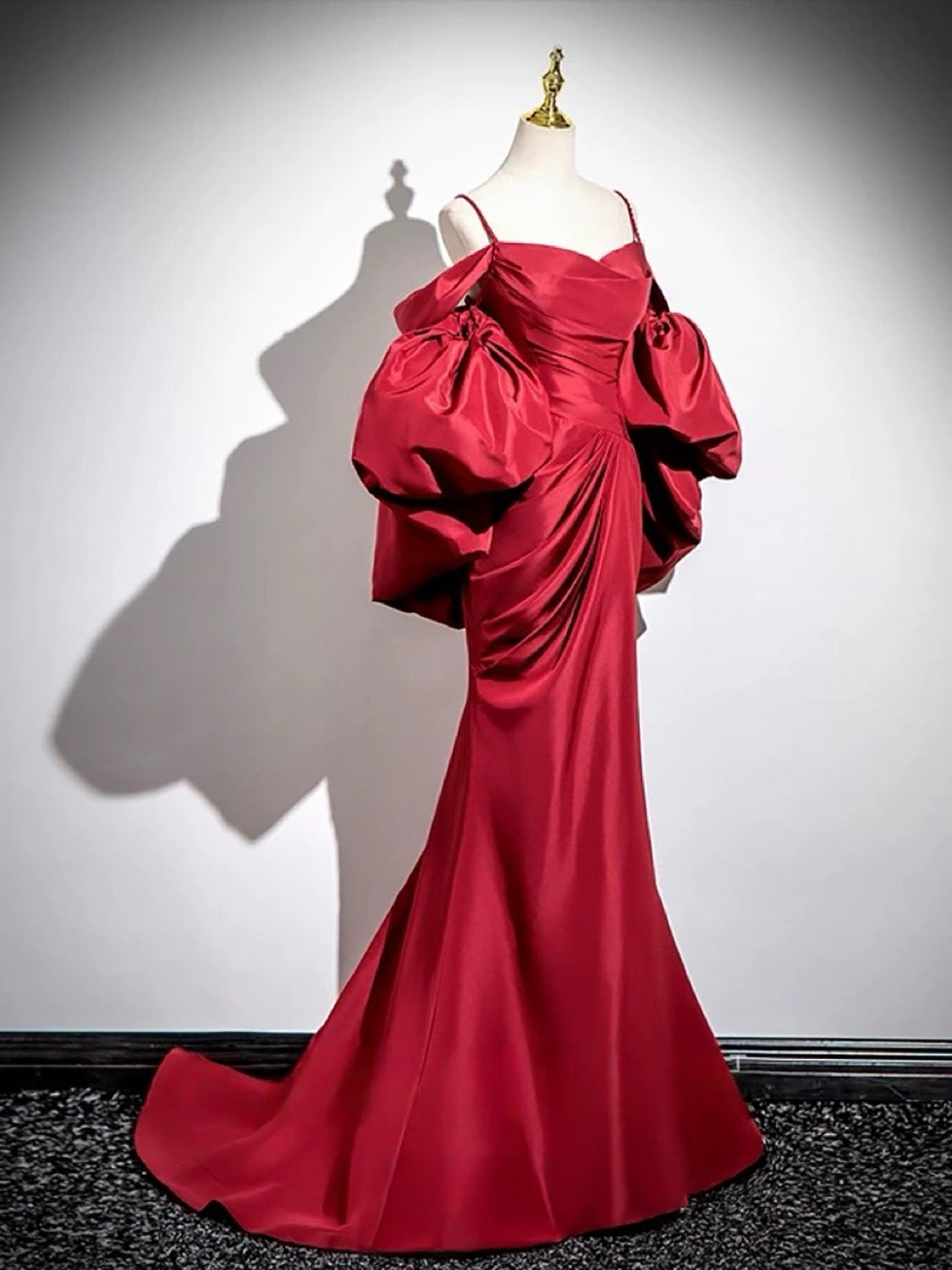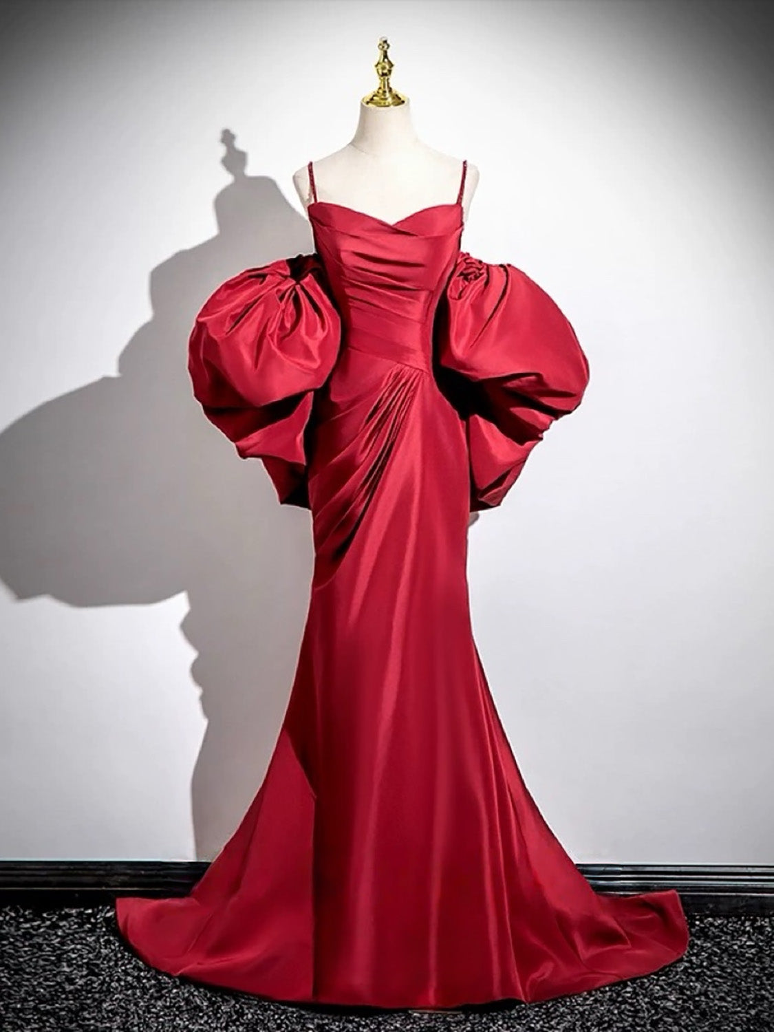 A-line V Neck Satin Puff Sleeves Sweep Train Red Prom Dress