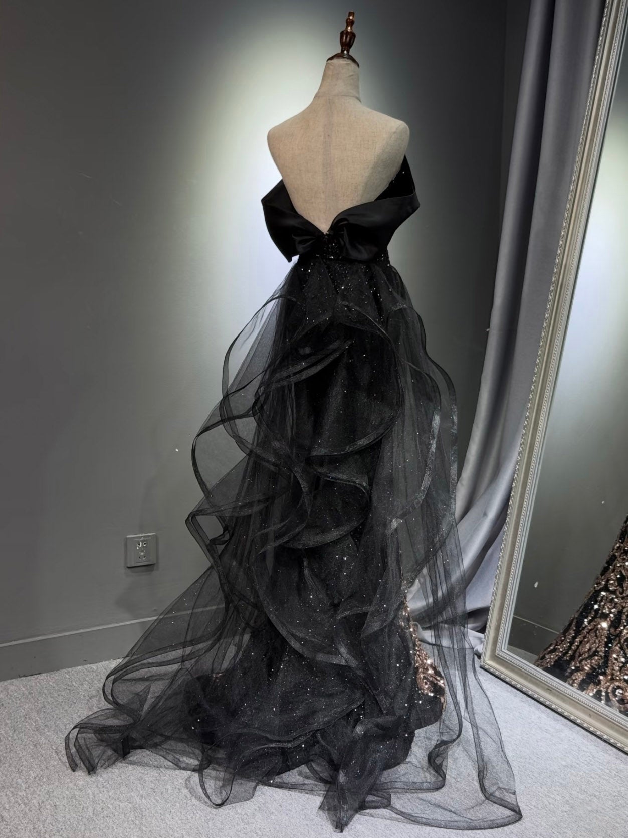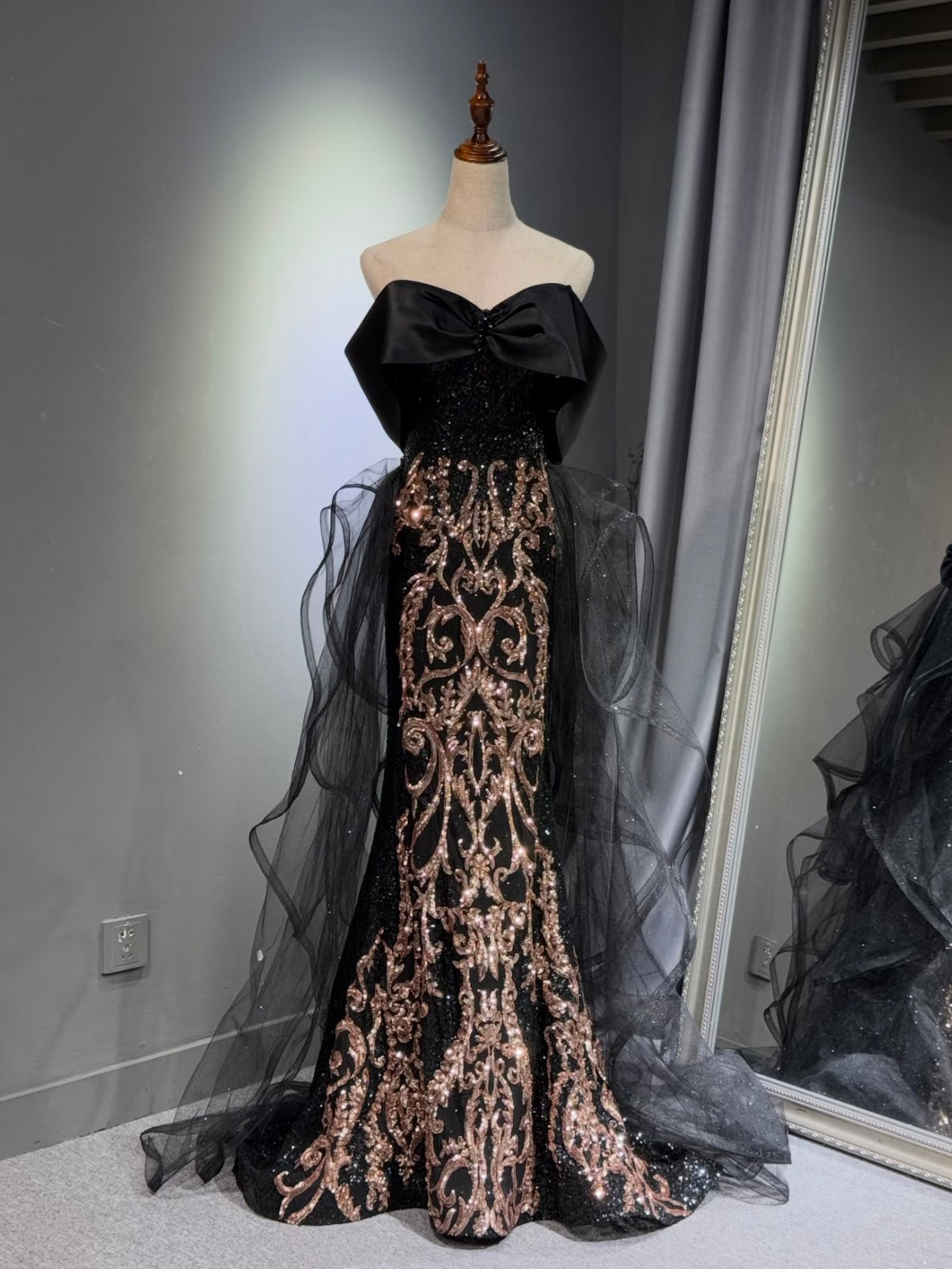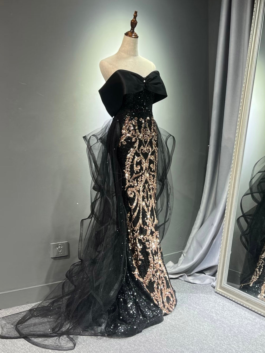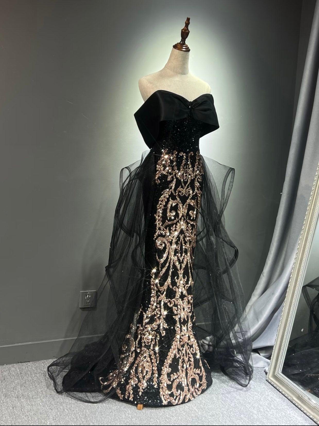 Mermaid Off Shoulder Sweep Train Sequin Black Long Prom Dress