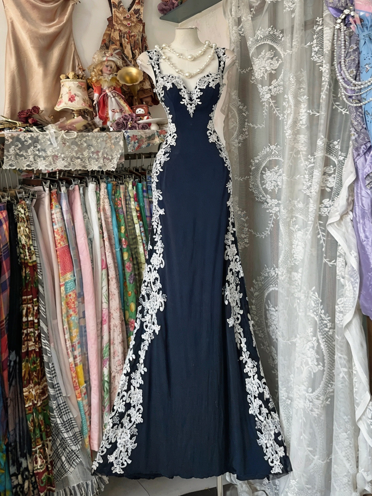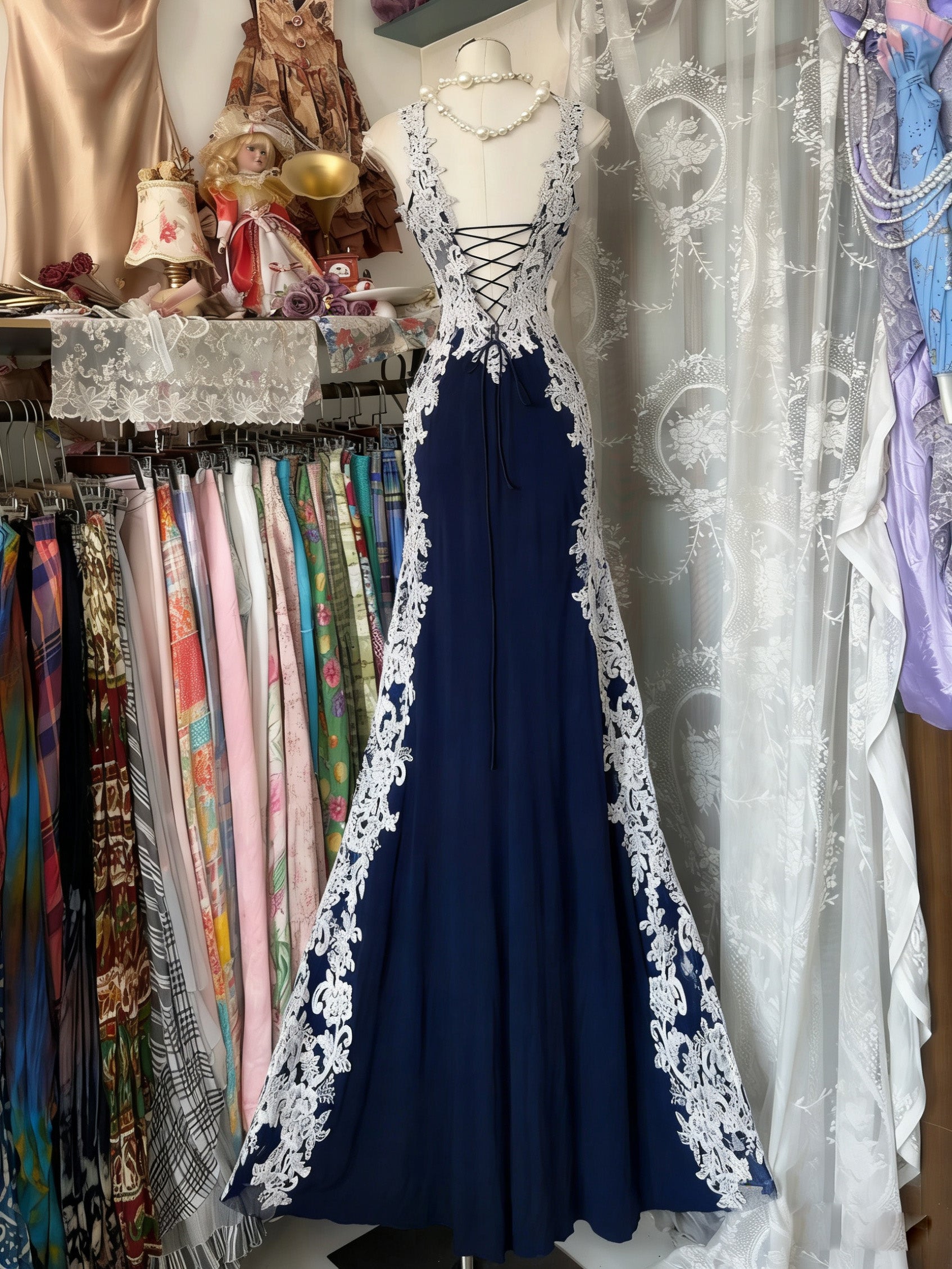 Mermaid Sweetheart Floor Length Lace Dark Blue Prom Dress