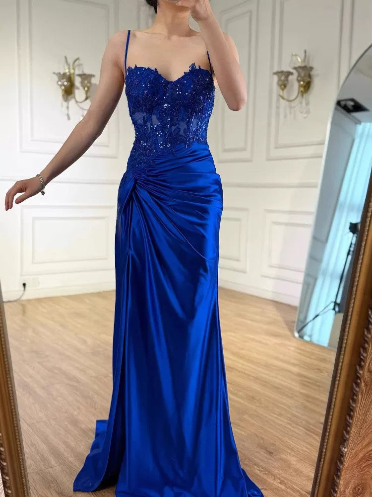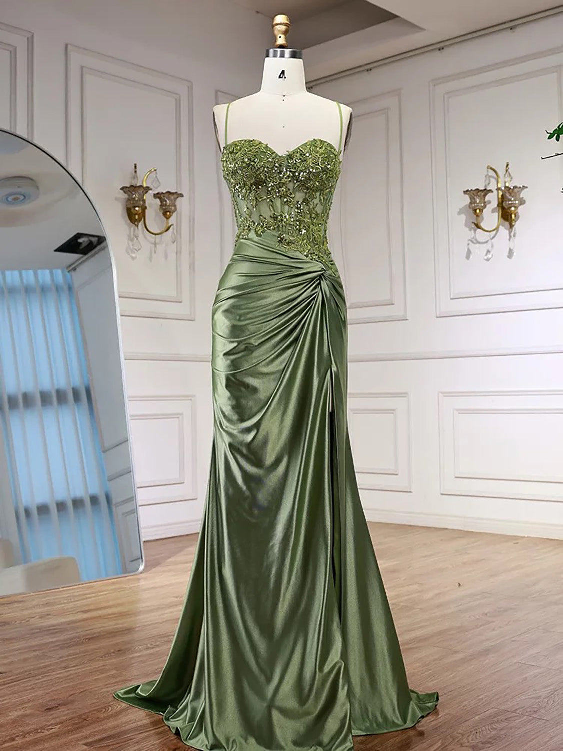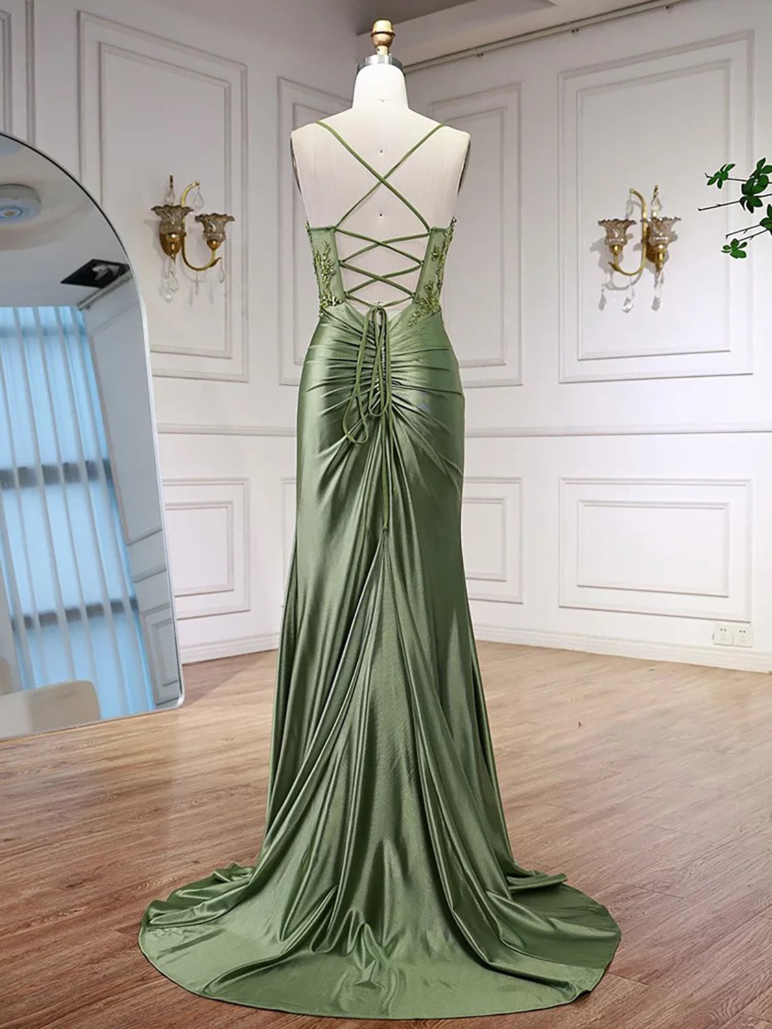 Mermaid Sweetheart Neck Satin Green Long Prom Dress with Lace Applique